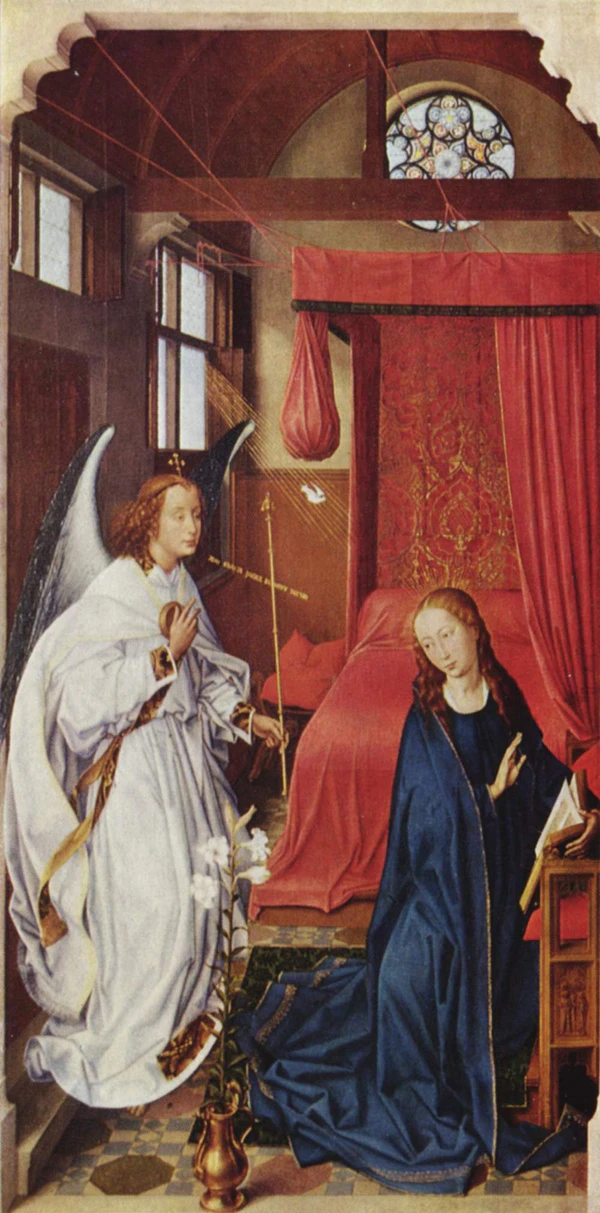 Мешок для штор в форме узла, часто встречающийся на кроватях того периода, изображён на центральной части картины, между Гавриилом и одним из ангелов[15]. На прикроватном серванте стоят верёвочный фитиль, подсвечник и колба с водой, на которую падает яркий свет из окна [1]. На полу выложена разноцветная плитка, похожая на покрытие из «Алтаря Святого Колумба» ван дер Вейдена. Стропила потолка заканчиваются рядом с краем кровати, а пол зрительно выходит на передний план. По словам Блума, так создаётся эффект «открытой сцены для святых фигур»[9].