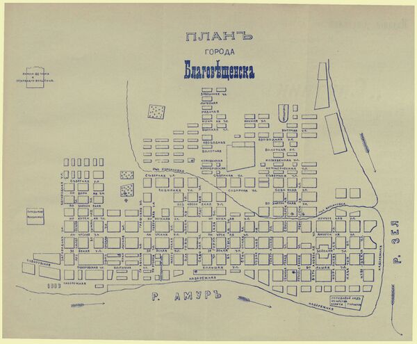 Благовещенск застраивался по типу римского военного лагеря: прямые улицы располагались параллельно и перпендикулярно друг другу. Одни брали начало от реки Амур, другие от реки Зеи. Кварталы представляли собой правильные прямоугольники. Такая планировка города сохраняется до сих пор. В настоящее время город протянулся на 8 км вдоль Амура, вдоль Зеи на 13 км.