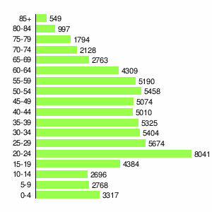 | Жителей | 11145 | 16007 | 22826 | 34177 | 50023 | 65065 | 71476 | 71144 | 70881 |