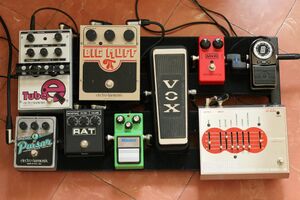 - Wah-wah (эффект, издающий «вау-вау», популяризировал этот эффект Джими Хендрикс, существуют 2 вида педалей: автовау и с педалью экспрессии, в первом случае, эффект идёт нециклично, в зависимости от уровня входного сигнала, во втором случае, музыкант сам, с помощью педали экспрессии, увеличивает или уменьшает силу эффекта) (англ. wah-wah);