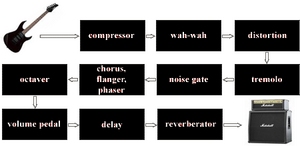Зачастую музыканты используют большое количество различных эффектов, объединяя их в цепочки. Чаще всего эффекты подключаются друг к другу последовательно, хотя встречаются и параллельные способы подключения. При последовательном подключении эффекты накладываются друг на друга, поэтому от последовательности подключения зависит звучание цепи. Параллельное подключение используется для возможности переключения за одно нажатие между разными последовательными цепями эффектов, либо две параллельно подключённые цепи эффектов смешиваются на выходе. Иногда отдельно обрабатывается чистый сигнал и сигнал с эффектов задержки. Также параллельно подключаются каналы при стереофонической обработке сигнала.