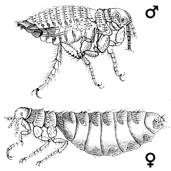 Самцы достигают в длину 4 мм, нераздутые самки — 4,5—5 мм, а раздутые (оплодотворённые) — 7 мм. Самцы на первый взгляд легко отличаются от самок тем, что спина их вогнута. У оплодотворённых самок брюшко сильно раздувается, но принимает не шарообразную форму, как у блохи проницающей, а вытягивается больше в длину и получает червеобразный вид, при этом кольца брюшка сохраняют взаимное положение и только почти равномерно удаляются друг от друга, отделяясь мягким слоем покровов белого цвета. Вследствие этого брюшко получает белый цвет с чёрно-бурыми кольцами.
