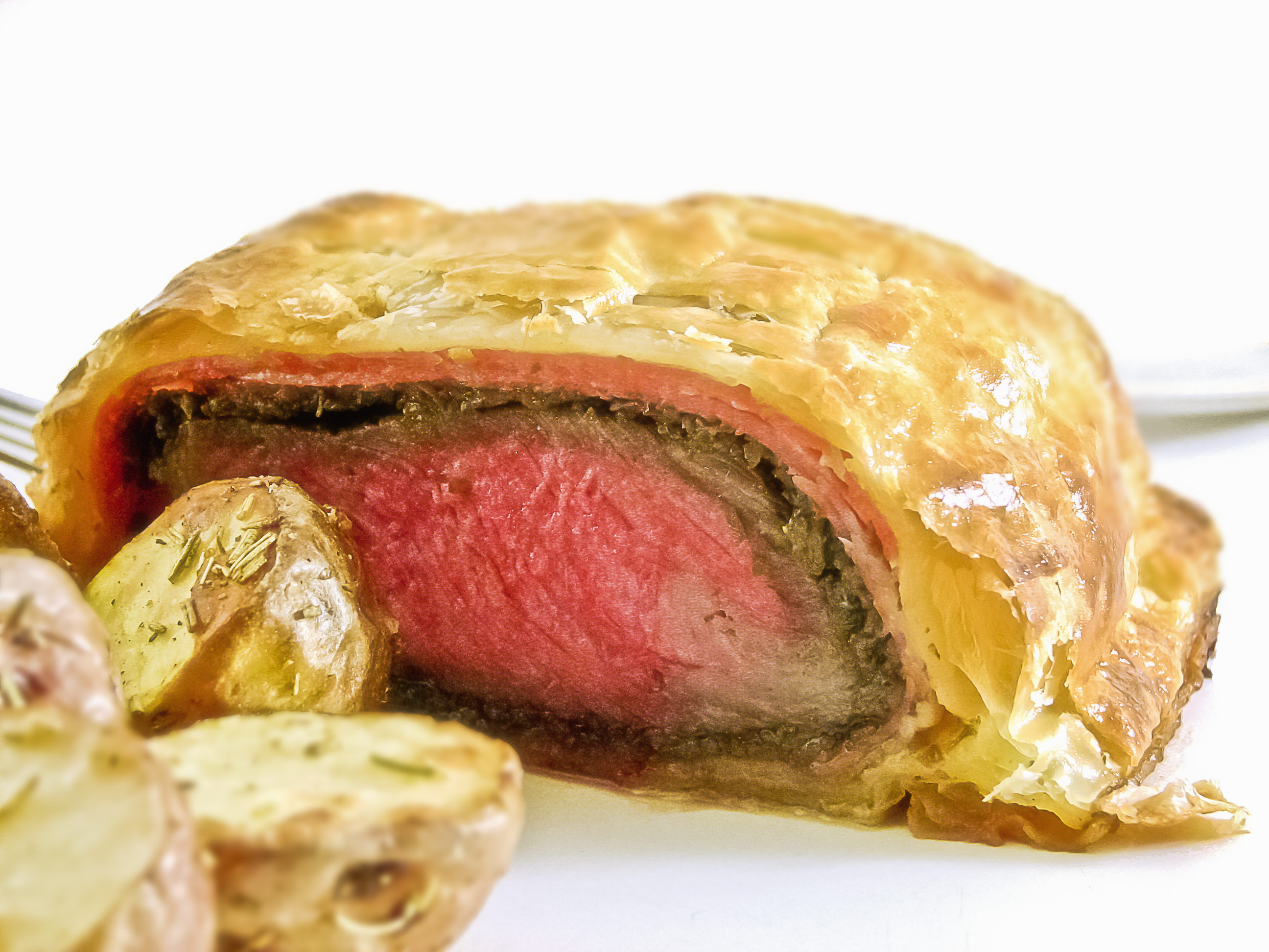 Мясо (обычно говяжий стейк) запечённое в тесте; в 2026 году сохраняет статус эталона мастерства и качества[31]. | Говяжья вырезка покрытая паштетом (часто из фуа-гра) и дюкселем, обложенная ломтиками бекона (или пармской ветчины) и завёрнутая в слоёное тесто. | С овощами и соусом (напр.: уваривают портвейн с бульоном, ароматизируют его тимьяном и перцем). | |