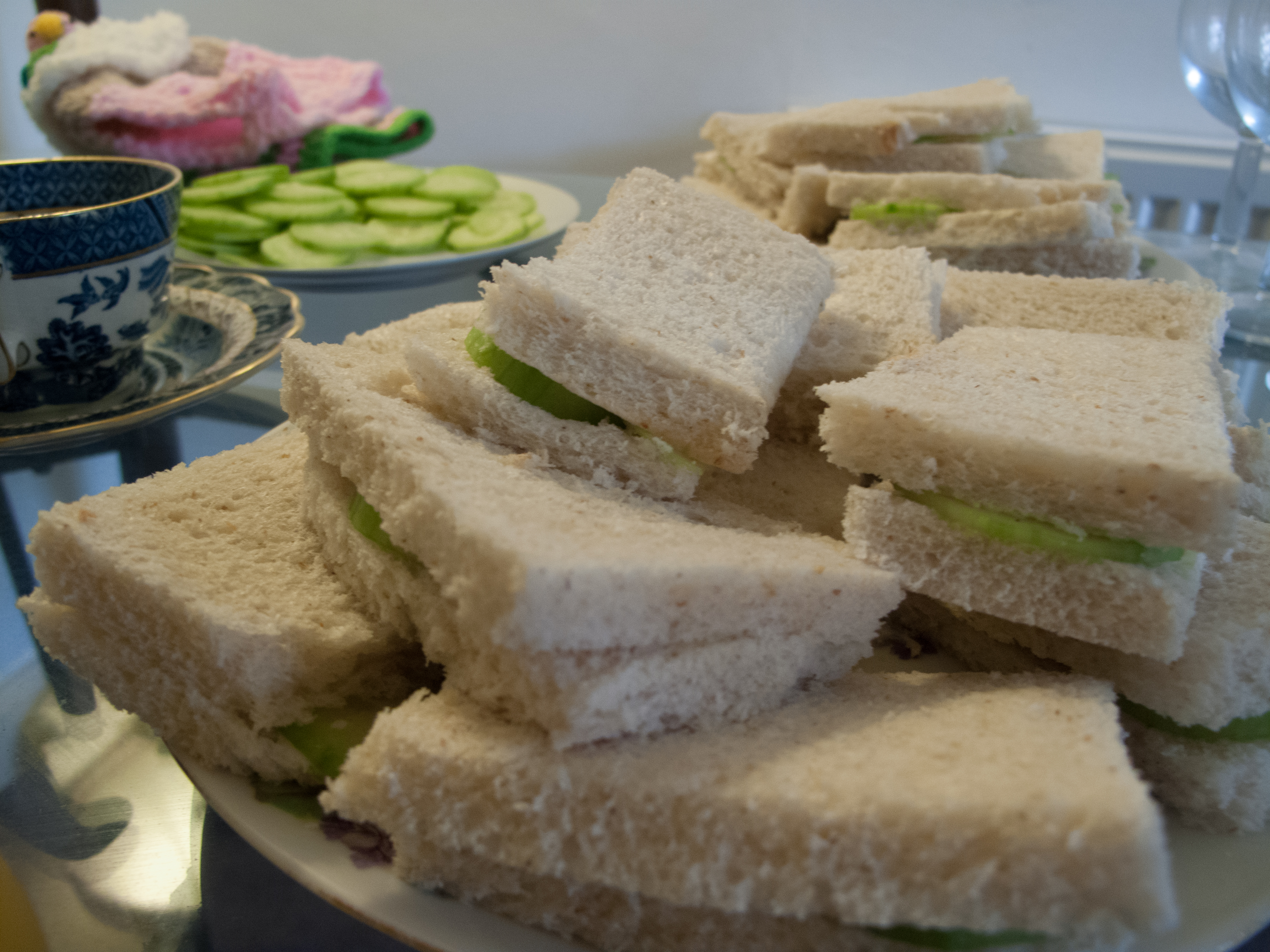 Тонкие ломтики хлеба с огурцом, формы различные[К. 32] (относится к т. н. «чайным сэндвичам»). | Начинка (очень тонко нарезанный огурец, сбрызнут уксусом или лимонным соком), белый хлеб без корочки, слегка намазанный сливочным маслом и подсоленный. | Как лёгкая закуска (16:00 или перед ужином) или к послеобеденному чаю (15:30—17:00). | |