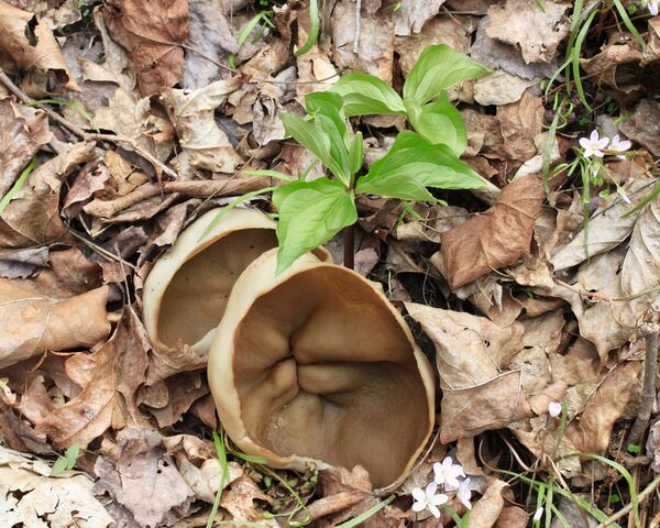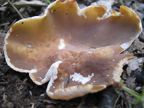 Плодовое тело представляет собой апотеций диаметром от 3 до 10 см, в редких случаях достигающий 21 см[4]. У молодых грибов форма шаровидная, с возрастом она раскрывается до блюдцевидной или чашевидной, а у зрелых экземпляров становится распростёртой с извилистым краем. Верхняя, внутренняя поверхность (гименофор) со временем становится морщинистой или жилковатой, особенно в центральной части. Её окраска варьирует от желтовато-бурой до тёмно-коричневой. Нижняя, наружная поверхность более светлая — от беловатой до серовато-розоватой — и имеет мучнистый налёт.