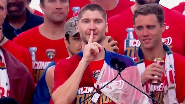 Во время чемпионского парада «Флориды» Бобровский вышел на трибуну с флагом России и произнес следующие слова: