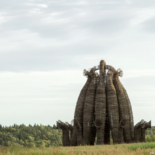 Над проектом Полисский и его команда работали полтора года: сначала сооружали металлический каркас из винтовой лестницы и дюжины гигантских, высотой в 22 метра, «труб», похожих на те, что в «оригинальном» Бобуре, после — оплетали их лозой по технологии, которая раньше использовалась при изготовлении корзин. Если стоять внутри, лоза просвечивает и при движении кажется, что колонны тоже движутся[3].