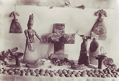 Богини со змеями были найдены в помещении рядом с дворцовым святилищем, в специально устроенных тайниках (каменных ящиках) вместе с другими предметами явно религиозного характера: вотивными изображениями женской одежды, ракушек, летающих рыб, мраморного креста.