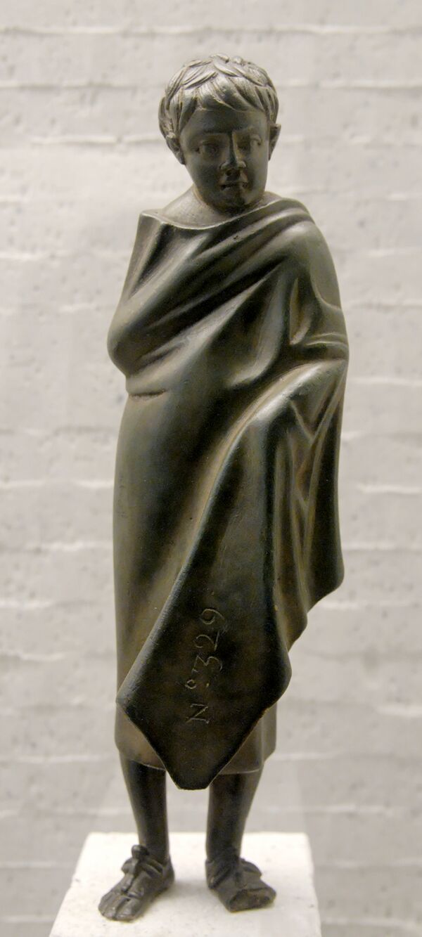 В зажиточных хозяйствах о детях заботилась няня (nutrix), которая обычно была рабыней (однако кормилицу могли нанять и из свободных людей). Однако от матери также требовалось присматривать за благополучием и воспитанием детей. Нормой была и любовь отца к своим детям; Катон Старший любил «постоять рядом с женой, когда она мыла или пеленала новорожденного»[29]. Ребёнок носил тогу с пурпурной каймой, обозначавшей его неприкосновенность, и оберёг-буллу. Няни иногда приносили бескровные жертвы богам, защищавшим и растившим детей. Большинство «обучающих» божеств — женского пола, вероятно, потому что они мыслились как божественные няни. Однако дар речи давали боги-мужчины: хотя женщине не возбранялось владеть ораторским искусством, оно было необходимо прежде всего мужчине для полноценной общественной жизни.