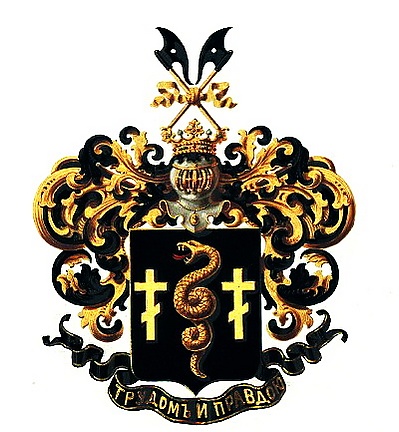 Щит украшен дворянским коронованным шлемом. Нашлемник: накрест два чёрных бердыша с золотыми рукоятками, связанные золотой лентой. Намёт: чёрный с золотом. Девиз: «ТРУДОМ И ПРАВДОЮ» золотыми буквами на чёрной ленте.