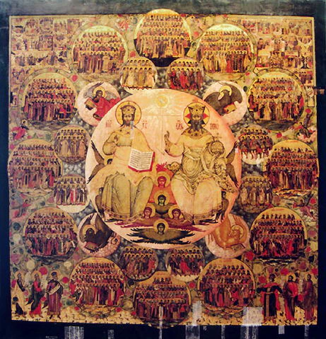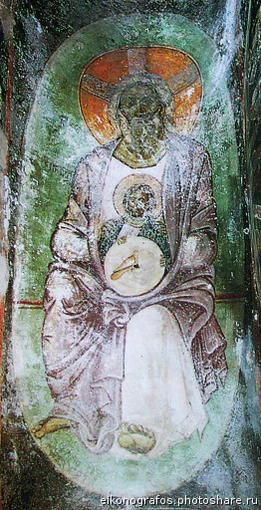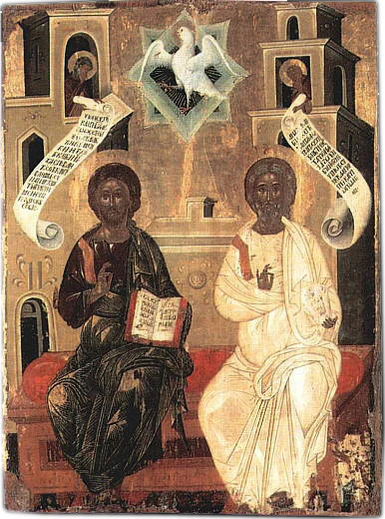 Особое значение имеет вопрос изображения Бога-Отца в образе Саваофа, или же Старца «Ветхого денми». Это изображение имеет греческий прототип, но на греческих фресках и миниатюрах в образе Саваофа изображается Вторая ипостась Троицы, Сын Божий. На это указывает наличие крещатого нимба. В таком же образе был изображен Христос в новгородской церкви Спаса на Нередице (1199 г.). Появление иной трактовки этого образа также связано с латинским влиянием: именно так Бог-Отец изображён на фресках Рафаэля. Самое древнее известное изображение Бога-Отца в образе Ветхого Старца — на латинской миниатюре из книги Адельгейм Гейман XI века[11]. В русской иконографии этот образ впервые появляется в Новгороде в конце XIV века.