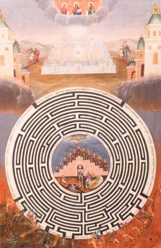 «Лабиринт духовный» — редкий иконографический тип в русской иконописи Нового времени. В среднем регистре таких икон находится изображение лабиринта, в верхней части — Горний Иерусалим, а в нижней — преисподняя. Современные искусствоведы воспринимают подобные иконы как наглядное изображение того, что путь в Небесный Иерусалим лежит через лабиринт жизни, который наполнен тупиками и ложными путями[14].