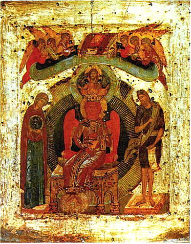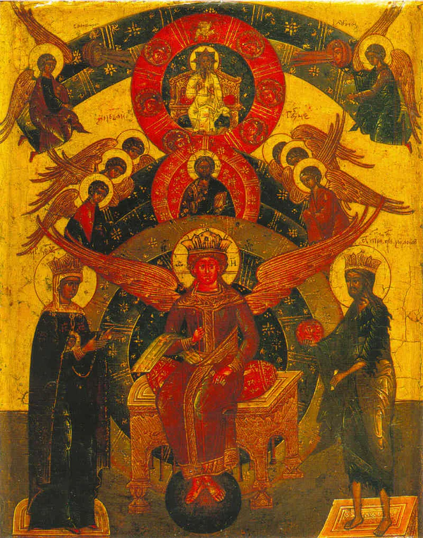 Другим характерным для Новгорода образом является аллегория Софии Премудрости Божией. София изображается в образе огнеликой девицы на троне. Комментариев к этой аллегории никто не оставил, однако ясно, что иконописец не принимает в расчёт, что София Премудрость Божия — это Вторая ипостась Троицы, воплотившаяся во Христе. Существует очевидная параллель в северогерманском искусстве: в сборнике Хильдегарды Бигенской изображена аллегория Софии в подобном новгородскому образе.