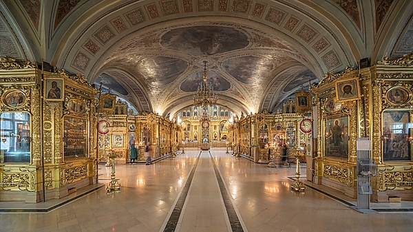 Главный престол освящён в честь праздника Богоявления, северный придел — во имя святителя Николая, южный — в честь праздника Благовещения. Собор является усыпальницей патриархов Московских Сергия и Алексия II[3].