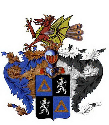 Описание герба: ДС, том II, стр.54 Щит разделен на четыре равных части, из коих в 1 и 4 в голубом поле изображены два золотые треугольника, во 2 и 3 частях в черном поле два серебряные льва в коронах стоящие на задних лапах. Щит увенчан дворянскими шлемом и короною, на поверхности которой виден выходящий дракон в короне и с тремя павлиными перьями означенными горизонтально на левой стороне шеи. Намет на щите голубой и черный подложенный золотом и серебром. |