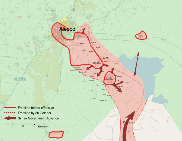 1 ноября правительственные войска овладели городом Сафира к юго-востоку от Алеппо, вытеснив оттуда части повстанческой Свободной Сирийской Армии[83]. 11 ноября правительственные войска заняли города Тель-Хассель и Тель-Аран (между Алеппо и Сафирой).