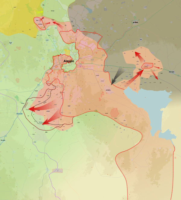 В феврале 2016 года сирийская армия в ходе успешного наступления окружила Алеппо с севера, отрезав боевиков в городе от снабжения со стороны турецкой границы[102][103].