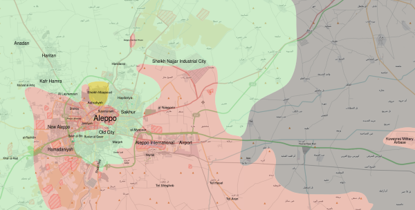 4 июня боевики из группировок Фронт ан-Нусра и Ахрар аш-Шам атаковали курдский район Шейх-Максуд на севере Алеппо. В ходе боев погибло до 40 человек[104]. Летом 2016 года правительственные силы сосредоточились на окружении повстанцев, осевших в восточном Алеппо; в результате 26 июля правительственные войска замкнули кольцо вокруг группировки повстанцев в восточной части города, заняв промзону Ларамун[105][106].
