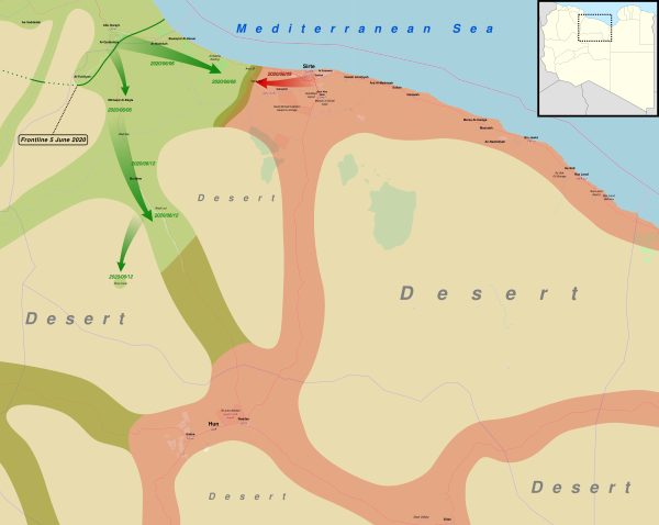 22 июня президент Франции Эммануэль Макрон осудил роль Турции в поддержке ПНС, назвав это «опасной игрой»[41]. В тот же день появились новости о том, что сирийские ополченцы будут отправлены в Ливию для борьбы с силами ЛНА[42]. Также в тот же день командующий африканским командованием Соединенных Штатов Америки генерал Стивен Дж. Таунсенд и посол США в Ливии Ричард Норланд встретились с Фаизом ас-Сараджем и его делегацией в Зуваре недалеко от границы с Тунисом[43]. 24 июня министр иностранных дел Италии Луиджи Ди Майо встретился с Фаизом аль-Сараджем в Триполи, чтобы подчеркнуть «необходимость возобновления политического процесса и прекращения иностранного вмешательства»[44]. 10 июля Египет начинает повышать военную готовность, готовясь к потенциальной схватке с Турцией из-за Ливии[45].