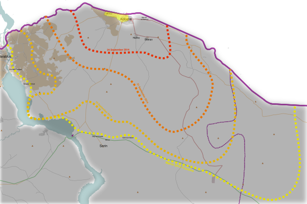 17 сентября 2014 года, после захвата стратегически важного моста через Евфрат, силы ИГИЛ начали масштабное наступление на курдские территории на севере Сирии, с использованием тяжелого вооружения (танков и артиллерии). Уже в первый же день они смогли захватить 21 деревню в окрестностях Айн-эль-Араб, а ещё через день смогли подойти к городу на 20 километров. В результате этого наступления тысячи курдов были вынуждены бежать в Турцию[11].