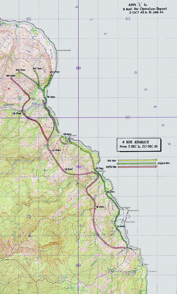 В 18:00 20 января 1944 года штаб пятой дивизии генерал-майора А. Х. Рэмси, подошедшей из Лаэ, занял место штаба девятой дивизии. Одновременно восьмая пехотная бригада сменила 20-ю. Переброска восьмой пехотной бригады, которая провела большую часть войны на гарнизонной службе в Западной Австралии, началась 10 января из порта Кэрнс[30]. Изначально планировалось, что она будет направлена в Лаэ, чтобы сменить 29-ю пехотную бригаду, воевавшую в районе Саламауа-Лаэ, но планы изменились, и в декабре восьмая бригада высадилась прямо во Финшхафене[31]. Бригада состояла из трёх пехотных батальонов, 4-го, 30-го и 35-го — все из Нового Южного Уэльса. Действия бригады по-прежнему поддерживали 2/12-й полевой полк, 532-й инженерный катерный и береговой полк и рота А Папуасского пехотного батальона. Первые потери бригада понесла в ночь на 22 января от дружественного огня, что было обычным явлением для войск, не имеющих опыта войны в джунглях. Двое австралийцев были убиты и двое ранены собственными товарищами[32].