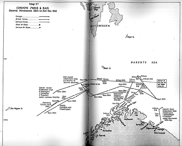 Кроме того, прикрытие обеспечивали два лёгких крейсера, HMS Sheffield и HMS Jamaica, прикрывавших до этого переход конвоя JW-51A. Этими кораблями — «Соединением R» командовал контр-адмирал Роберт Л. Барнетт, державший флаг на HMS Sheffield. Они вышли из Кольского залива 27 декабря и должны были встретить конвой в самой опасной точке маршрута. Дальнее прикрытие состояло из линкора Кинг Джордж V, тяжелого крейсера Бервик и трёх эсминцев. Его задача состояла в том чтобы нанести удар по германским тяжелым кораблям, в первую очередь по линкорам «Tirpitz», «Scharnhorst», в том случае, если они будут принимать участие в нападении на конвой.