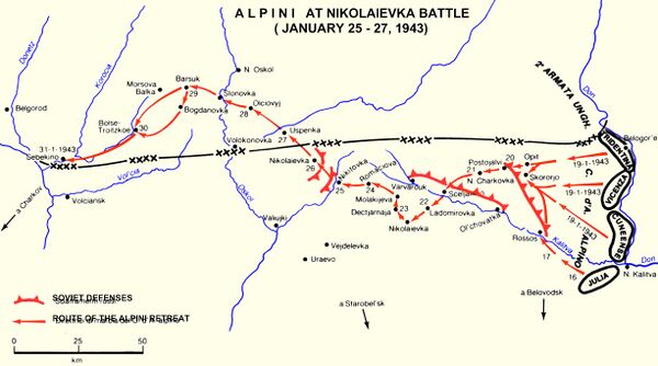 После начала Острогожско-Россошанской операции войска Воронежского фронта под командованием генерала Ф. И. Голикова окружили и уничтожили 2-ю венгерскую армию у местечка Свобода на реке Дон к северо-западу от итальянских позиций, а затем отбросили назад ещё и 24-й армейский корпус вермахта (немцы располагались к югу от итальянцев, венгры — к северу), после чего устремились к итальянцам. В составе Итальянского Альпийского корпуса в России были три альпийские дивизии: 2-я «Тридентина», 3-я «Джулия», 4-я «Кунеэнзе», а также 156-я пехотная «Виченца». Их материально-техническое обеспечение было очень слабым, а моральное состояние солдат — плачевным. В течение трёх дней советские части продвинулись на 200 км, обошли с флангов оборонявших позиции на Дону итальянцев и окружили всё итальянское войско. 17 января итальянцы, венгры и немцы стали отступать по ледяной степи, каждый километр пути теряя десятки и даже сотни своих солдат от обморожения, холода и стычек с советскими войсками: это происходило вопреки приказу держать фронт любой ценой.