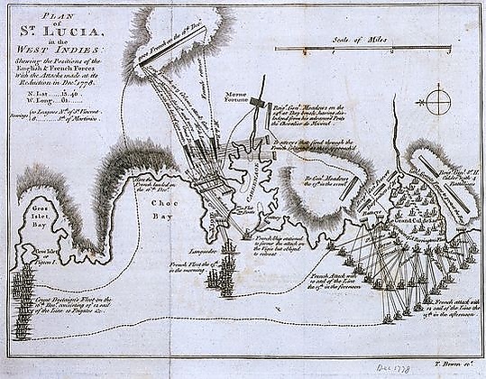 7 сентября 1778 года, французский губернатор Мартиники, маркиз де Буйе, сделал перввый крупный ход войны в Вест-Индии: застал врасплох и захватил британский остров Доминика. 4 ноября, французский адмирал граф д’Эстен вышел в Вест-Индию из Бостона. В тот же день, в подкрепление британскому флоту в Вест-Индии, от Санди-Хук Нью-Йорк был направлен коммодор Уильям Хотэм. Хотэм имел «пять линейных, бомбический корабль, несколько фрегатов, и большой конвой».[3] Конвой состоял из 59 транспортов, доставлявших 5000 человек генерал-майора Гранта.[3] Французский флот сбил с курса сильный шторм, не дав ему прибыть в Карибский бассейн раньше британского. Адмирал Самуэль Баррингтон, британский командующий на Подветренных островах, соединился с вновь прибывшим Хотэмом 10 декабря на острове Барбадос. Людям Гранта не было разрешено сойти на берег и они провели следующие несколько дней на борту транспортов. Баррингтон и Хотэм вышли к острову Сент-Люсия утром 12 декабря.[3]