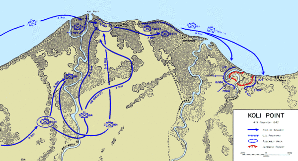 На следующий день батальон Пуллера форсировал Налимбиу, а солдаты 164-го полка возобновили движение по направлению к берегу. 7 ноября подразделения морской пехоты и армии соединились с подразделениями на берегу и направились на восток к точке в 1 миле (2 км) к западу от Метапоны, где они окопались возле берега в связи с информацией о Токийском экспрессе, который отправился на Гуадалканал и мог перевозить подкрепления к Коли ближайшей ночью. Японцы, однако, успешно разгрузили подкрепления в другом месте Гуадалканала этой ночью и эти подкрепления не имели отношения к боевым действиям у мыса Коли[27].