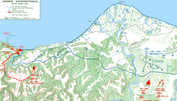 23 октября силы Маруямы прошли через джунгли и достигли американских оборонительных позиций. Кавагути по своей инициативе начал отводить правое крыло к востоку, рассчитывая, что американская оборона там будет слабее. Маруяма через одного из своих офицеров приказал Кавагути придерживаться первоначального плана наступления. После этого Кавагути был отстранён от командования и замещён полковником Тосинари Сёдзи, командиром 230-го пехотного полка. Вечером, осознав, что силы левого и правого флангов всё ещё не добрались до американских позиций, Хякутакэ перенёс начало атаки на 19:00 24 октября. Американцы оставались в полном неведении о приближении войск Маруямы[17].