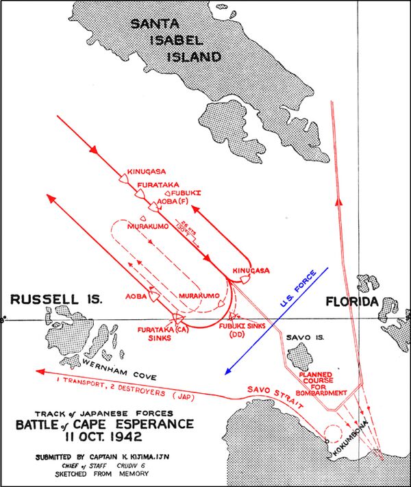 Эскадра Гото прошла несколько дождевых шквалов, пока не подошла к Гуадалканалу на скорости 30 узлов (56 км/ч). Флагманский корабль Гото Аоба возглавлял колонну японских крейсеров, за ним шли Фурутака и Кинугаса. Фубуки шёл по правому борту от Аобы, а Хацуюки по левому. В 23:30 корабли Гото вышли из последнего дождевого шквала и их обнаружили радары Хелены и Солт-Лейк-Сити. Японские корабли, напротив, не были оборудованы радарами, и они не знали о присутствии Скотта.[19]