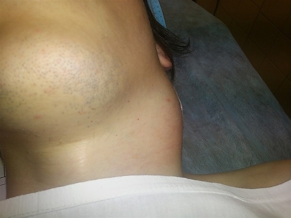 - Наличие плотного эластичного образования округлой или овальной формы на боковой поверхности шеи, чаще всего в области сонного треугольника (между грудино-ключично-сосцевидной мышцей и нижней челюстью).