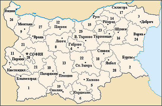 В административном отношении Болгария делится на 28 областей, которые подразделяются на 264 общины[30]. Общины руководятся кметами. Центральное государственное управление в областях осуществляется «областными управителями», которых назначает Совет министров. В соответствии с Регламентом Европейского союза № 1059/2003, территория Болгарии разделяется на два региона первого порядка и шесть регионов второго порядка. Они являются не административно-территориальными единицами, а только статистическими зонами страны.