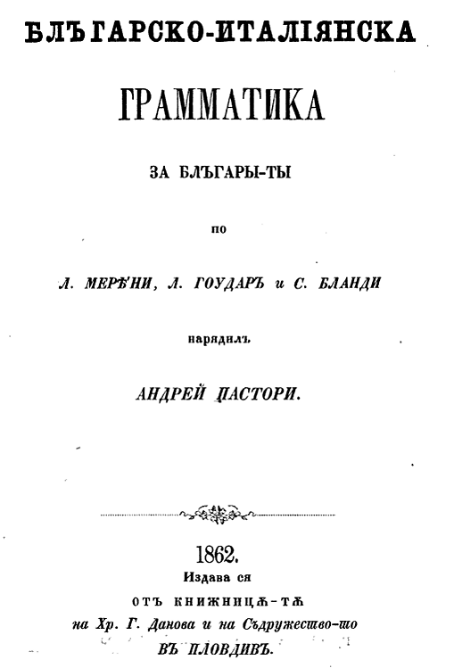 В 1862 году учитель латыни Андрей Пастори издал в Пловдиве первый болгарский учебник итальянского языка.[5]