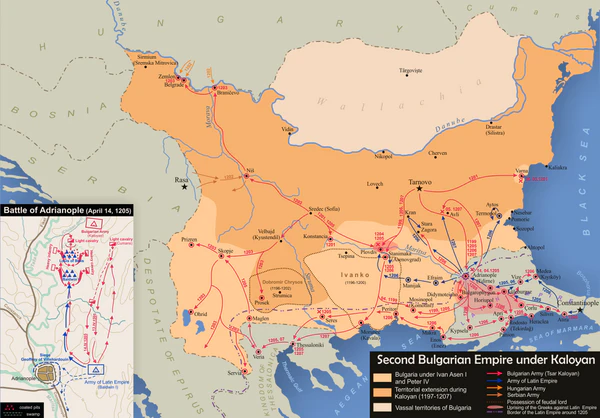 В марте — апреле 1207 года Калоян осаждал Адрианополь, но болезни и нехватка провианта заставили его отступить. 4 сентября 1207 года Бонифаций Монферратский, король Фессалоникский, погиб в битве с болгарами близ Мосинополя. После этого Калоян осадил Фессалоники, но в октябре 1207 года был убит заговорщиками, царём стал его племянник Борил[1]