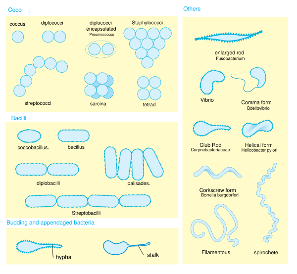 - Спириллы и спирохеты — спирально изогнутые формы.