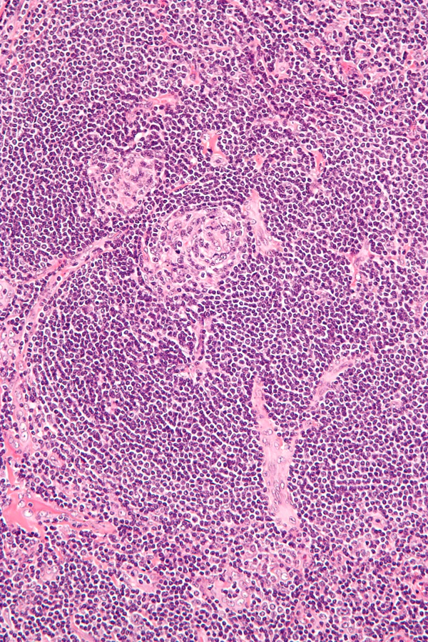 - ГВБК: клетки редуцированных зародышевых центров фолликулов экспрессируют CD20, CD21 и CD23. Количество Т-лимфоцитов (CD3+, CD45RO+) в фолликулах и межфолликулярных зонах снижено по сравнению с нормой. Межфолликулярные пространства состоят из CD68+ плазматических клеток, S-100+ интердигитирующих дендритных клеток и кровеносных сосудов;