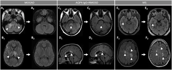 - поражение головного мозга демонстрирует высокую вариабельность. У детей часто наблюдается картина острого диссеминированного энцефаломиелита, в то время как у взрослых очаги в мозге на момент диагностики выявляются менее чем в половине случаев. Характерно наличие немногочисленных, но крупных очагов, обычно двусторонних, с нечёткими контурами. У детей чаще вовлекаются ядра ствола мозга. Легкоменингеальное усиление встречается редко, как изолированно, так и в сочетании с корковыми поражениями. Вариабельное паренхиматозное усиление может затрагивать ствол мозга, серое и белое вещество, перивентрикулярные области;
