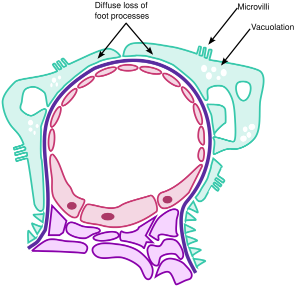 Патогенез БМИ представляет собой сложное переплетение повреждения подоцитов, иммунной дисрегуляции и генетической предрасположенности, в результате которого происходит слияние ножек подоцитов и нарушение функции щелевой диафрагмы, что в конечном итоге проявляется тяжёлой протеинурией и нефротическим синдромом. В основе БМИ лежит дисфункция подоцитов — высокоспециализированных клеток, формирующих важнейший компонент почечного фильтра. Их ножки, образующие щелевую диафрагму, обеспечивают избирательную фильтрацию крови, не позволяя белкам проникать в мочу[4].