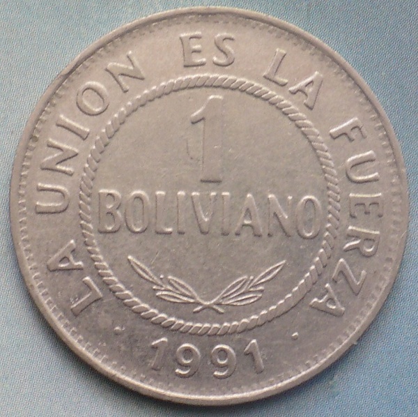 На реверсе — номинал, девиз Боливии (исп. LA UNION ES LA FUERZA — «Единство есть сила») и год выпуска.