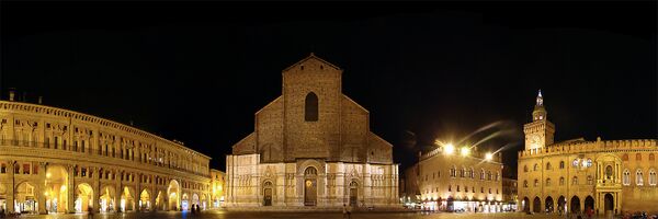 На площадь выходит неоконченный фасад базилики Сан-Петронио. Эта базилика, посвящённая св. Петронию, была начата в 1390 году, должна была стать одной из величайших церквей, когда-либо известных, имея в длину 208 м и в поперечнике 142 м, но постройка её была прервана в 1759 году. Всеобщее внимание привлекают наружные барельефы работы Якопо делла Кверча, изображающие историю сотворения мира. В 1530 году в этой базилике происходила коронация Карла V.