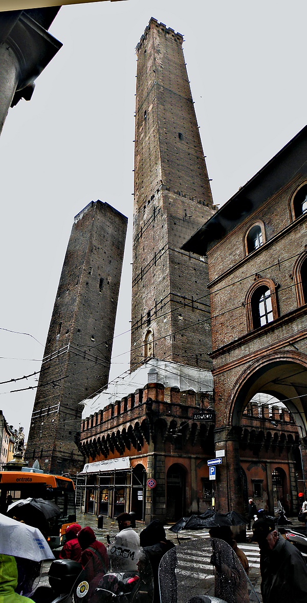 Вертикальными доминантами города, расположенными здесь же, являются две знаменитые «падающие» башни из простого кирпича. Более высокая башня (97 м), продолжающая наклоняться и ныне, — Башня Азинелли, с вершины которой видны Эвганейские горы, расположенные к северу от реки По. Башня Гарисенда достигает половины высоты своей соседки и наклонена ещё сильнее.