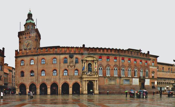 Наконец, на западной, общей для обеих площадей стороне, находится грандиозное здание Palazzo Comunale (муниципалитет), включающее в себя Palazzo D’Accursio, построенное в 1290 году и реконструированное после пожара (1425 год) архитектором Фьораванте. Здание и ныне выглядящее как огромное и суровое укрепление.