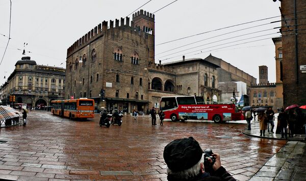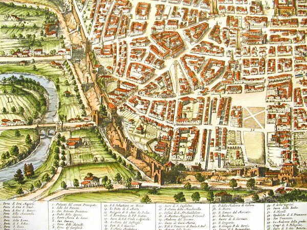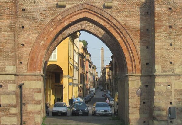 К началу XX века Болонья все ещё сохраняла колорит средневекового города: была окружена кирпичной стеной, имевшей 6 км по периметру, с 12-ю воротами, городские улицы большей частью были тесными и кривыми, вдоль многих из них тянулись портики и аркады, размещённые внутри стен города многочисленные памятники старины — церкви, дворцы и палаццо — почти все относились к XIII и XIV столетиям с их неизбежными башнями и зубчатыми стенами, всё это было окрашено в серый или красноватый цвет, покрыто трещинами и расселинами.