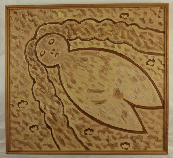 На светло-охристом фоне с коричневыми вкраплениями по центру композиции крупным планом изображена женская фигура, выполненная условно коричневым контуром. Фигура размещена по диагонали, выделяется двумя косами и лаконичностью форм. Колористическое решение построено на сочетании охристых и коричневых тонов, что подчёркивает декоративность и выразительность работы в жанре ню.