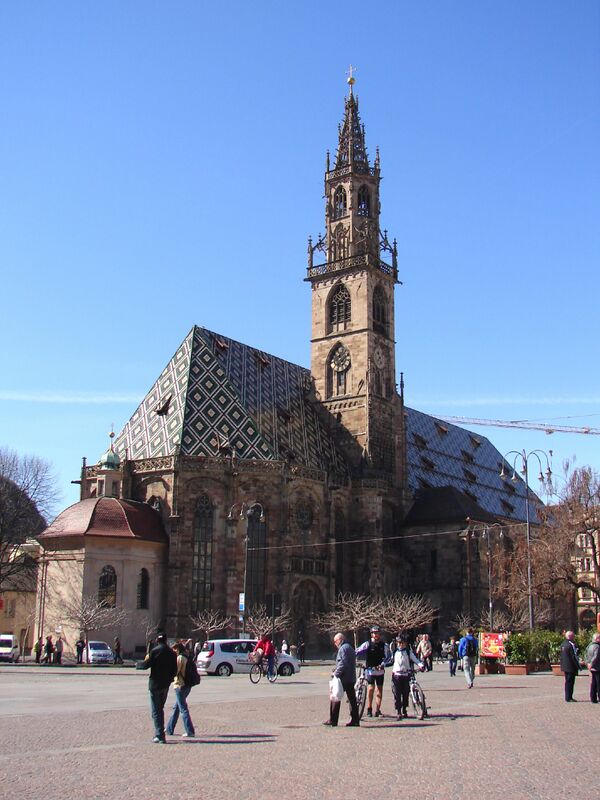 На юго-западной стороне площади возвышается готический кафедральный собор. Его начали строить в 1295 г. в романском стиле ломбардские рабочие, продолжили строительство в готическом стиле в 1340 г. рабочие из Швабии, а закончилась работа в первом десятилетии XV века. Колокольня высотой 65 м — работа швабского архитектора и скульптора Ханса Лутца фон Шуссенрида (1501—1519).