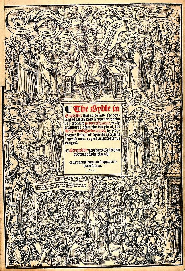 Первое издание Большой Библии[6] вышло тиражом в 2500 экземпляров, выпущенных в Париже в 1539 году. Большая часть тиража была напечатана в Париже, и после ряда злоключений, когда напечатанные листы были задержаны французскими властями по подозрению в ереси (поскольку отношения между Англией и Францией в то время были несколько напряжёнными), издание было завершено в апреле 1539 года в Лондоне Ричардом Графтоном. В период с 1540 по 1541 год последовало шесть редакций данной Библии. Второе издание 1540 года включало предисловие Томаса Кранмера, архиепископа Кентерберийского, рекомендовавшее чтение Священного Писания (предисловие Кранмера было также включено в первую Епископскую Библию[7]).