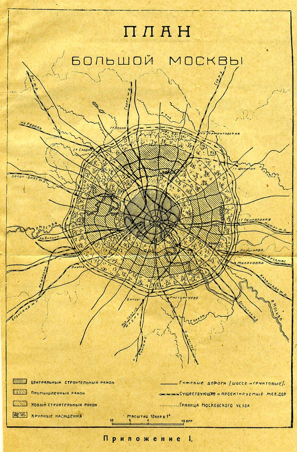 В градостроительном плане «Большая Москва» нашли отражение идеи, разработанные ранее А. В. Щусевым в плане «Новая Москва» и Б. В. Сакулиным в «Инфлюэнтограмме» московской агломерации.