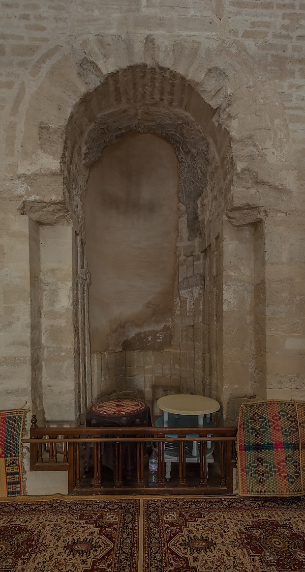 Внутренний двор с четырёх сторон окружён галереей с аркадами, покрытой крещатыми сводами. На южной стороне площадки находится «притвор», шириной в пять этажей, который ведёт в молитвенный зал. Его центральная часть немного выступает во внутренний двор, а сверху пристройку закрывает купол. В отличие от более старых куполов времён Аглабидов, этот не опирается на восьмиугольный барабан[6]:73. К опорам, поддерживающим данную конструкцию, примыкают колонны, а западный выступ, направленный на внутренний двор (если смотреть в сторону молитвенного зала, то он находится справа), частично перекрывает высокая мраморная доска, вырезанная в форме арки и содержащая надписи в технике куфического письма. Эта табличка была чем-то вроде наружного михраба для тех, кто молился во внутреннем дворе, а по своему виду она походила на аназу (короткий посох)[6]:73. В соответствии со стилем куфического письма, текст относят к периоду правления династии Фатимидов (X век)[8]:29. Деревянные двери, ведущие из притвора в молитвенный зал, изготовил плотник по имени Ахмед Шаабуни. На них видна резьба с геометрическими и растительными мотивами, хотя первоначально они были раскрашены разными цветами[1].