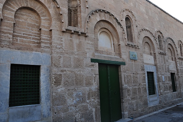 Примечательный восточный внешний фасад мечети покрыт рядом декоративных ниш или же углублений в форме подковообразных арок, расположенных над дверьми и окнами. На некоторых из них высечены надписи на арабском языке. Данный фасад, возможно, относится к оригинальной мечети IX века, однако его необычный вид может свидетельствовать и о более позднем периоде постройки[4]. Учёные датируют эту конструкцию эпохой Зиридов, в том числе Люсьен Голвин и Жорж Марсэ[1][6]:108. Ещё одной примечательной деталью является повторное использование византийской мраморной панели с христианскими мотивами, которая встроена в стену над одним из окон. На плитке находится изображение двух павлинов, расположенных лицом друг к другу (по неизвестной причине рисунок немного стёрт резцом), на фоне леса и с греческой надписью вверху. Текст обрывается, но он, видимо, был частью обращения к Иисусу Христосу и Богородице[8]:36–38. Подобное наличие христианских мотивов с элементами фигуративизма в мечетях трудно объяснить, однако существует предположение, что Фатимиды принимали неортодоксальные подходы в искусстве, в том числе взгляды местных меценатов византийского происхождения. В древней надписи нет ссылок на какую-либо христианскую фигуру, поэтому можно допустить следующее: текст передавал общее религиозное послание мечети[8]:36–39.